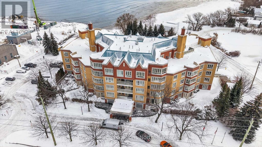 Collingwood's Exclusive Sunset Cove Waterfront Condo Community has a rare offering; an updated end unit with unobstructed PANORAMIC Georgian Bay Views! Located in a private, quiet corner of the 4th floor, this 1,289 sqft, 2 bedroom, 2 full bathroom condo is flooded with natural light all day long. The floorplan allows for layout options with a wide, oversized living space to include a dining + reading + lounging space. Enjoy cozy nights in front of the fireplace watching our local surfers conquer the Bay. The primary suite also has a water view + walk-in closet + 5pc ensuite and the spare bedroom converts easily to a den/sitting room with its beautiful Murphy Bed. Enjoy the upscale convenience and security of Sunset Cove, with heated underground parking, storage, library, patio/BBQ area, professionally maintained grounds & always friendly concierge service. The Gathering Room welcomes residents to enjoy the pool table, ping-pong, viewing parties & kitchen facilities. During warmer months, enjoy the salt water pool and private sandy beach on the shores of Georgian Bay. Sunset Cove is a short walk from all our historic downtown has to offer; restaurants, shopping, waterfront, parks & more. If you are looking for luxurious, effortless living with convenience, warmth and community, book your private viewing today. (id:6289)