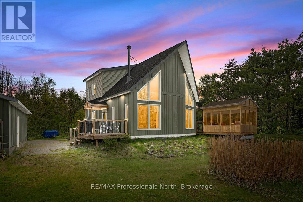 Welcome to 1059 Tiffany Lane a riverside retreat in the heart of the Haliburton Highlands. Nestled along the tranquil banks of the Gull River, this is a rare gem that blends modern comfort with the timeless appeal of cottage country living. This 3-bed, 2-bath home offers a harmonious balance of contemporary design & natural beauty; an ideal sanctuary for year-round living or a luxurious weekend escape. With approximately 1,100 square feet of thoughtfully designed space, the home features an open-concept layout that maximizes natural light & frames stunning views of the riverfront. The great room boasts soaring 20-foot ceilings, creating an airy & inviting space to gather & unwind, while the WETT-certified wood stove adds warmth and rustic charm. The upper-level primary suite serves as a private retreat, complete with a 4-piece ensuite, in-suite laundry, & windows overlooking the river. Downstairs, a 5-foot poured concrete insulated basement offers ample storage. Outside, an armour stone shoreline adds both function & visual appeal, providing a solid and picturesque riverfront. A private dock invites peaceful mornings and spontaneous paddle adventures down the Gull River. The screened in sunroom is ideal for relaxing summer evenings & the firepit offers a perfect gathering space under the stars. The home features an artesian well & sits on a quiet private road, just minutes to the town of Minden. The detached 18 x 24 ft garage provides excellent storage, while the generous driveway allows parking for all your guests. The Gull River is celebrated for its crystal-clear waters & gentle currents, perfect for kayaking, canoeing, or floating peacefully downstream. With direct access to Gull Lake, your boating & fishing options expand into one of Ontario's most beloved lake systems. 1059 Tiffany Lane is more than a home, its an invitation to slow down, reconnect and fully embrace the cottage lifestyle. The water is waiting! (id:6289)
